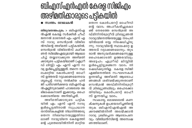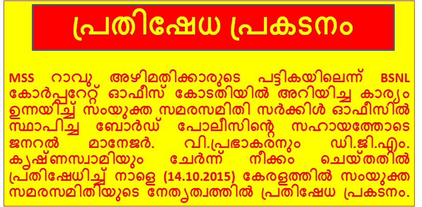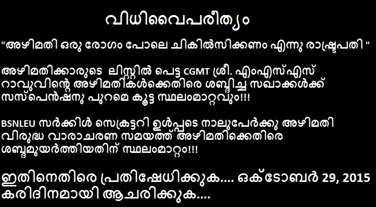 Yes comrades, the officer who is facing serious vigilance inquiries and included in the "Agreed List" as per the instruction from CVC leashed vindictive actions against those who are raising voice against his corruption. Hence Comrades, We are in the right path against the corruption. There may be very hard reactions from the beneficiaries of Corruptions, but we will not turn back. We will not lose our prestige. We will not lose our self respect. We will keep our head high in front of any autocratic Rulers. So Comrades March Ahead. Nothing can defeat you. By the declaration of BSNL that Sri. M.S.S Rao is in agreed list and under some serious vigilance inquiries, it is proved that whatever we have raised in all these months are true to the facts. So Be united and Move forward… We will save BSNL Kerala from Corruption, Autocracy and Jungle Raj.