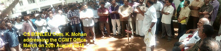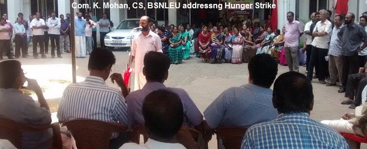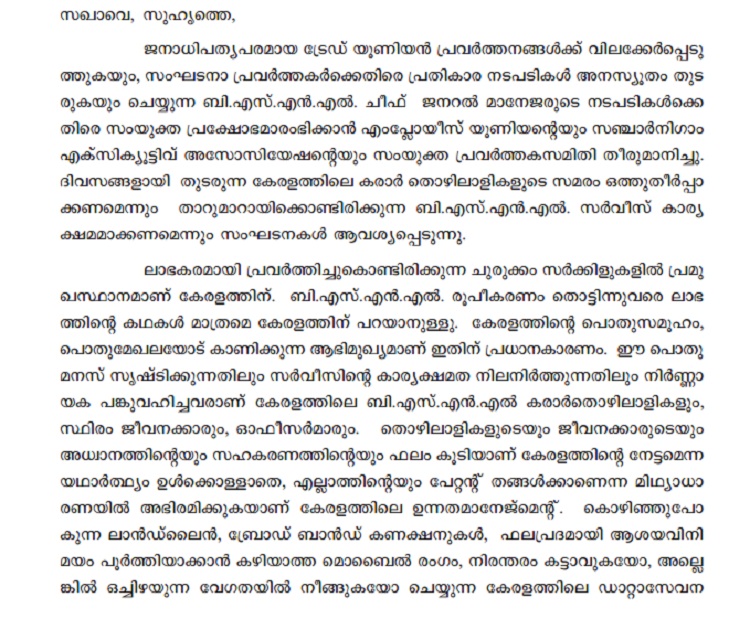 We also demand withdrawal of all vindictive actions like suspension, charge sheet and transfer against the whistle blowers - the latest being transfer of Com. K Mohanan Circle Secretary BSNLEU from Trivandrum to Kannur, Com. Biju Raghavan, Dist. Secretary BSNLEU TVM to Palakkad, Com. Sanal Kumar. S Dist. Vice President BSNLEU to Kannur, Com. Santhosh Kumar, Asst. Secretary BSNLEU to Kozhikkode, who are already under suspension.