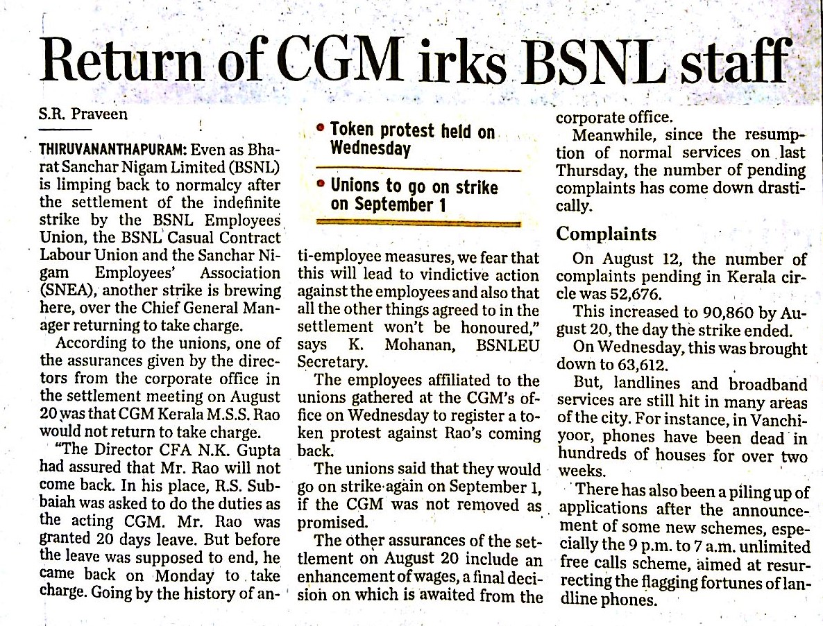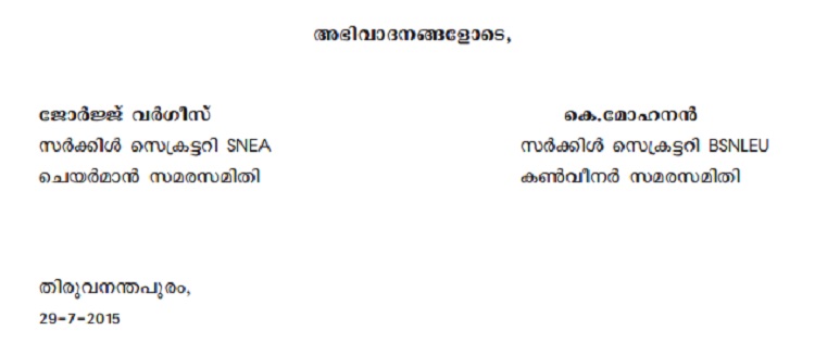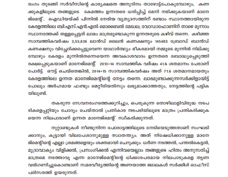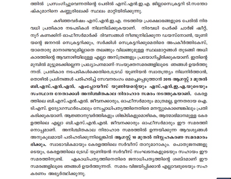 Comrades, Contrary to the assurance given by Director CFA Shri.N.K.Gupta in the meeting held on 20-8-2015, that all vindictive actions taken by the circle management will be withdrawn, the Kerala circle administration is going ahead with vindictive actions against union/association leaders and workers. Unnecessary provocations are being created by the circle administration to book the leaders of unions/associations. Finally 15 leaders including the circle, district leadership were suspended without any genuine reason and only to establish the high handedness and the anti labour approach of the circle management. Instead of taking steps to create an atmosphere conducive for development, the administration themselves charging false police complaints and court cases against the leaders of the major recognized union of non-executive and the major executive union of SNEA and also CCLU leaders. Kerala circle has been earning profit since its formation with the hard work and dedication of its employees and not with the contribution of “smart working” any single person as claimed by Sri. MSS Rao.