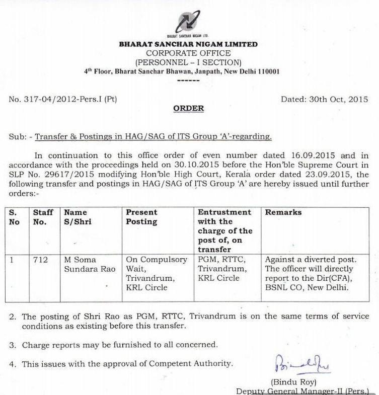 Hon Ernakulam HC directed that Sri M S S Rao shall be permitted to continue as CGM, Kerala for 2 months. Since Sri L. Anantharam was already joined as CGM, Kerala on 23.09.2015, BSNL approached the Hon SC by filing the SLP. BSNL pleaded that Mr Rao is in the Agreed list and he cannot be continued as CGM which is a sensitive post. More than that industrial unrest is going on in the Circle which he could not resolve as CGM. In any case, he cannot be continued as CGM. BSNL informed the Hon SC that Sri M S S Rao who is under compulsory wait will be posted as Principal, RTTC, Trivandrum and will ensure that it is not a lower post. This proposal is accepted by the Hon Supreme Court.