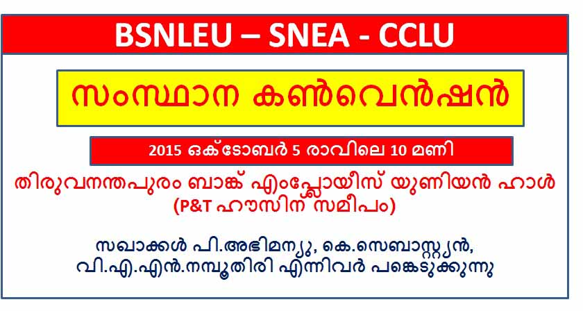 Com. P. Abhimanyu, GS, BSNLEU and Com. K. Sebastin, GS, SNEA are visiting Trivandrum on 05.10.2015, and will be addressing a meeting there. This meeting is taking place in the backdrop of severe victimisations imposed on the leaders of BSNLEU and SNEA in Kerala circle.