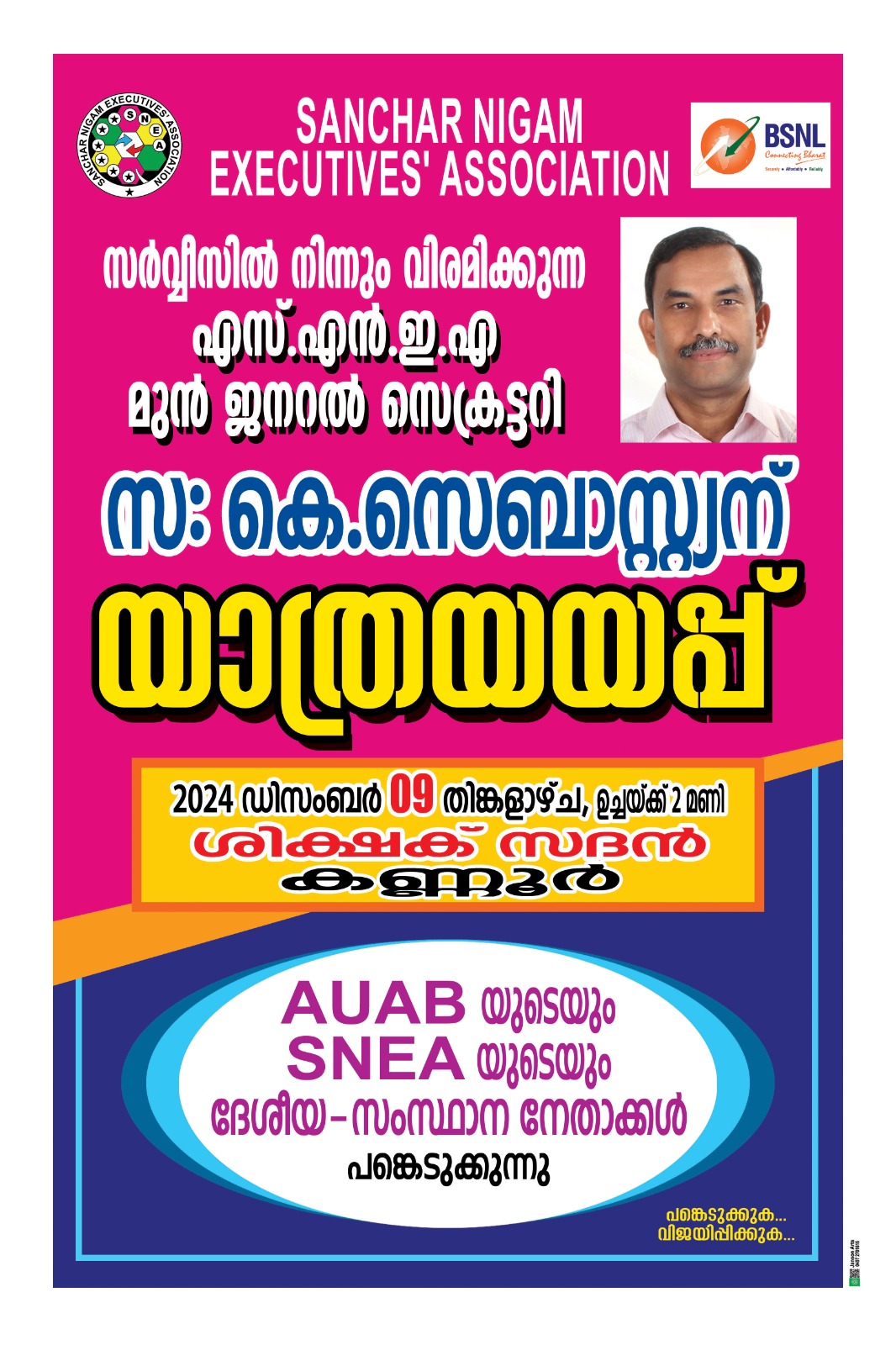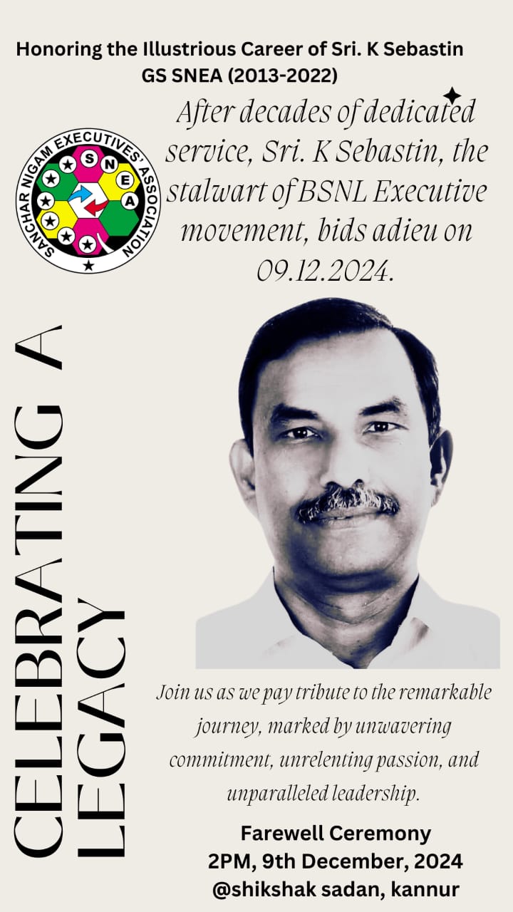 After decades of dedicated service, Shri K.Sebastin, the stalwart of BSNL Executive movement bids adieu on 9/12/2024.